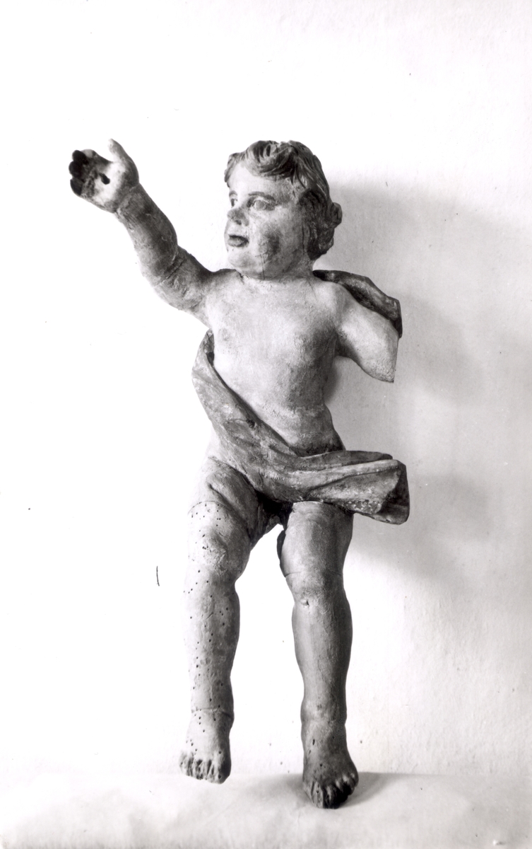 Titel: Skulpturen är en putto. En allegorisk liten amorin som ofta ingick som staffage i altaruppsättningar eller (ännu vanligare) på orgelfronter. De hade i sina händer olika ikonografiska föremål som tydliggjorde sammanhangen.