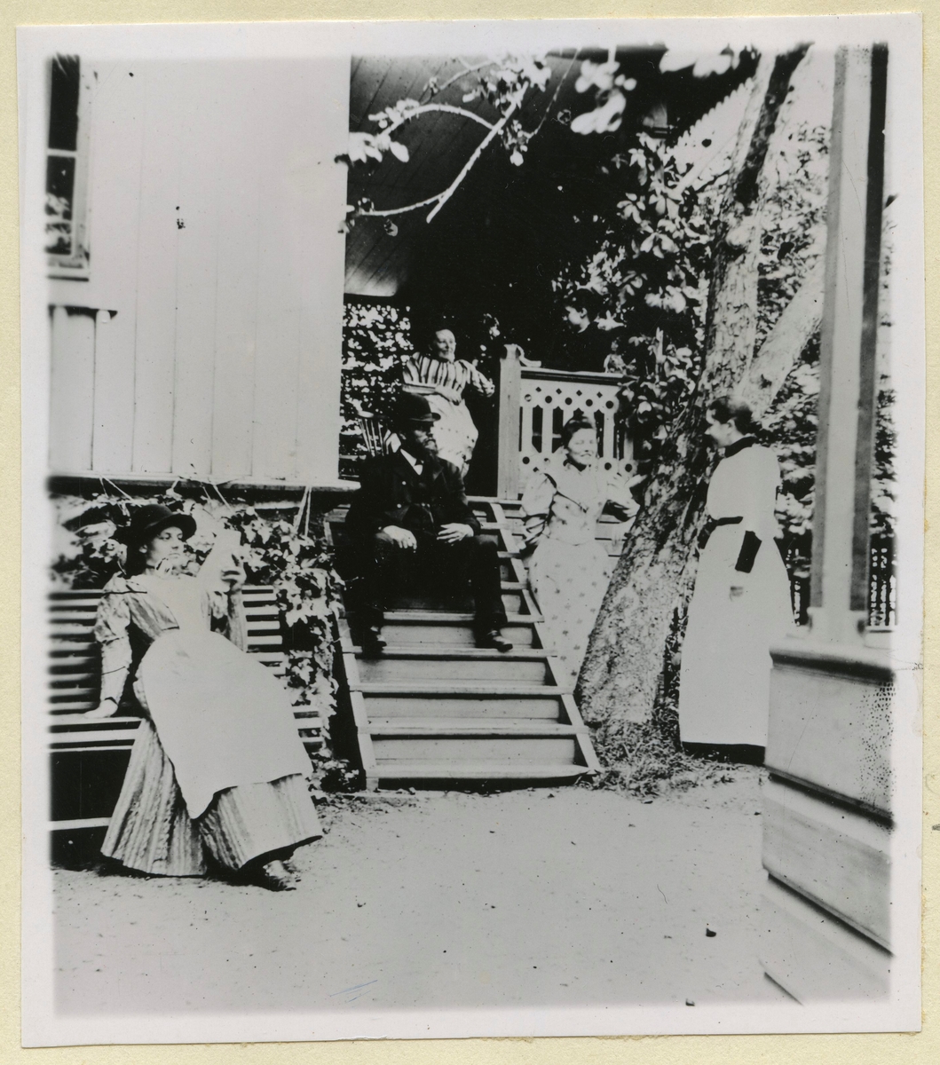 Harbergska gården 1893. Carl Johan Hullgren och hustrun Clara Mathilda i trappan.