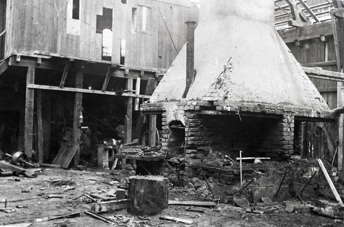 Titel: Smedjan, byggd 1860. Under rivning och ombyggnad omkring 1920.