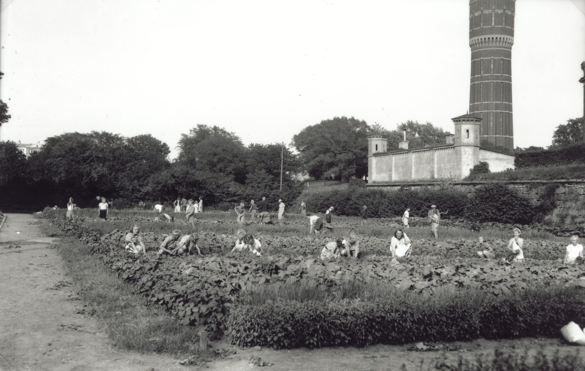 Trädgårdsskötsel vid Tullskolan 1942-07-31. Under andra världskriget bedrev många skolor trädgårdsskötsel som ett led i folkförsörjningen.