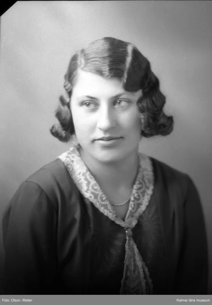 Ateljébild på en kvinna i halsband, klänning och spetskrage. Enligt Walter Olsons journal är bilden beställd av fröken Astrid Håkansson ifrån Lundtorp.