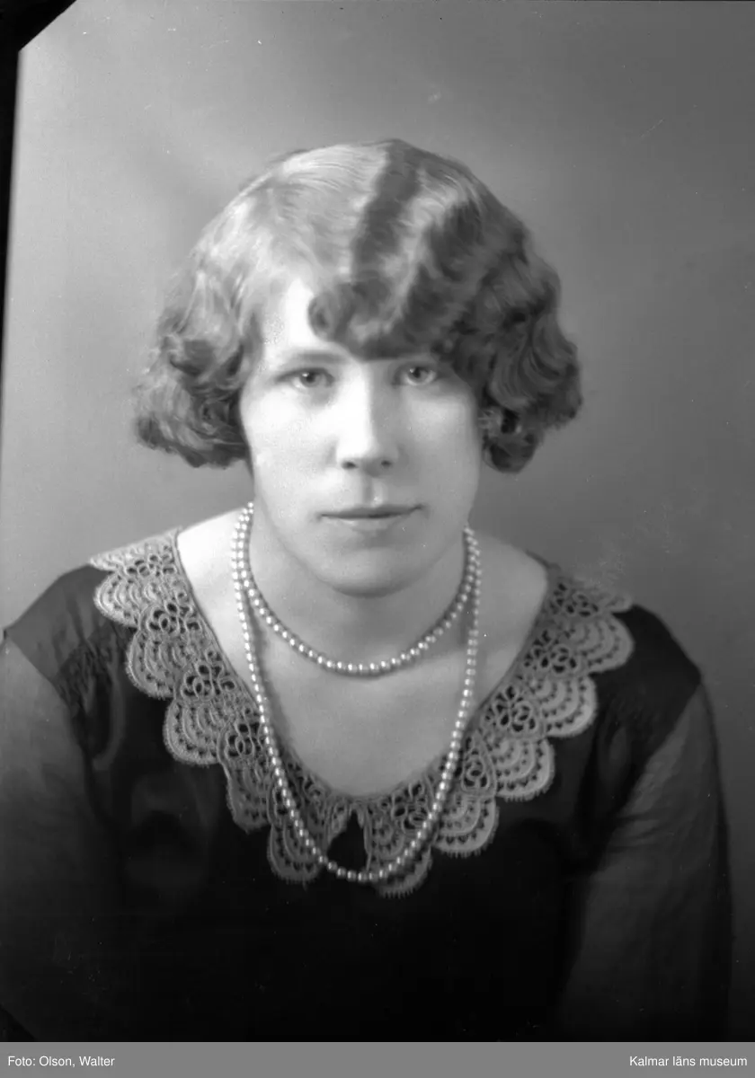 Ateljébild på en kvinna i klänning, spetskrage och pärlhalsband. Enligt Walter Olsons journal är bilden beställd av Anna-Lisa Olaisson.