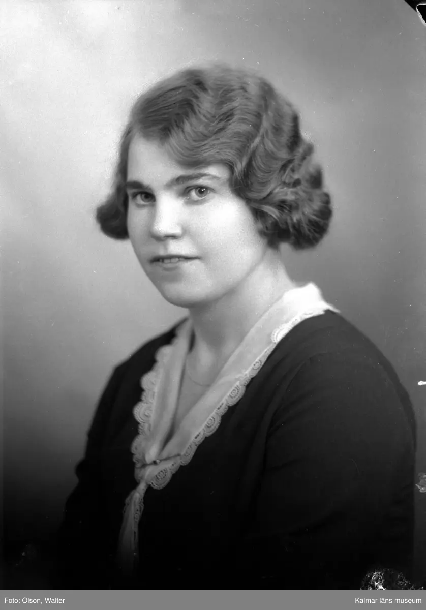 Ateljébild på en kvinna i jumper, spetskrage, brosch och spetskrage. Enligt Walter Olsons journal är bilden beställd av Berta Andersson ifrån Blomkulla.