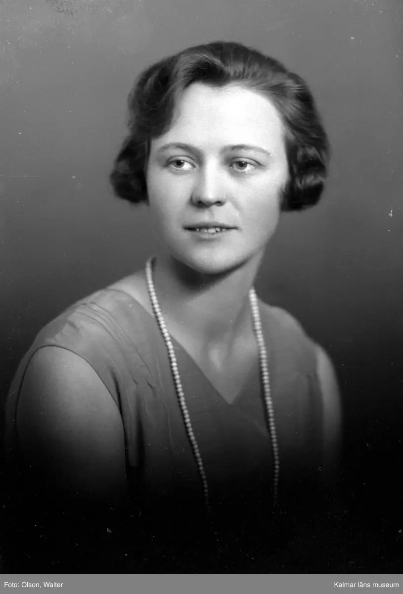 Ateljébild på en kvinna i halsband och klänning. Enligt Walter Olsons journal är bilden beställd av Ingrid Svensson.