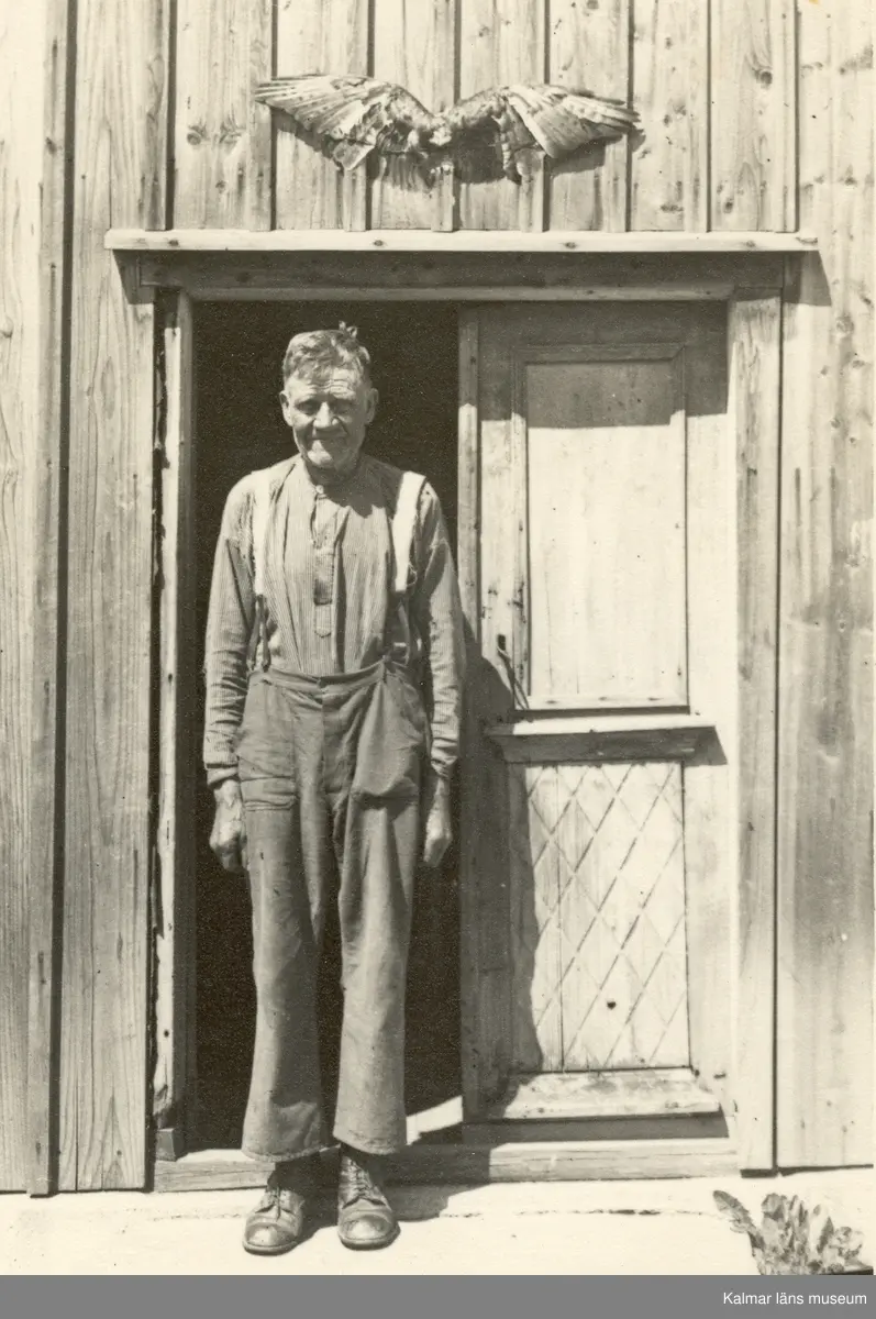 Hök, uppspikad som skyddsmedel ovanför dörren.