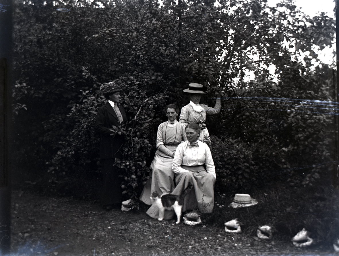 Grupporträtt av fyra kvinnor. En av dem är fröken Rosén. På marken syns snäckor vid en grusväg.
