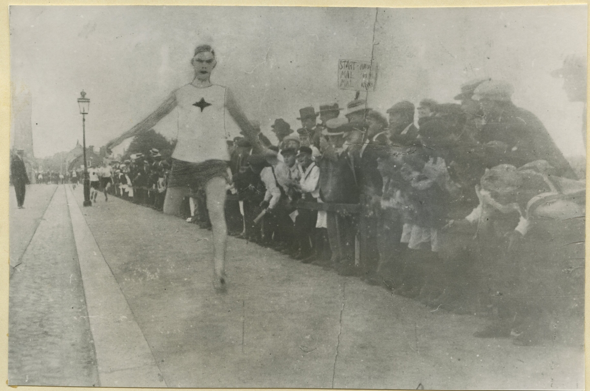 Detta unika kort visar det tillfälle då disp. E.C:son Brutte i sin ungdom fick böta 50 kr för att hans förening haft löpning å gata, utspänt en ulltråd över denna och avlossat startskott med revolver. Allmänheten reagerade starkt inför denna hårda dom och en i hast arrangerad insamling gav 70 kr i behållning. Dessförinnan hade de fem styrelsemedlemmarna anhållit att få sitta av böterna å "Vita Briggen" med en dag per man, men detta generösa anbud avslogs barskt av oförstående myndigheter. - 4juli 1915