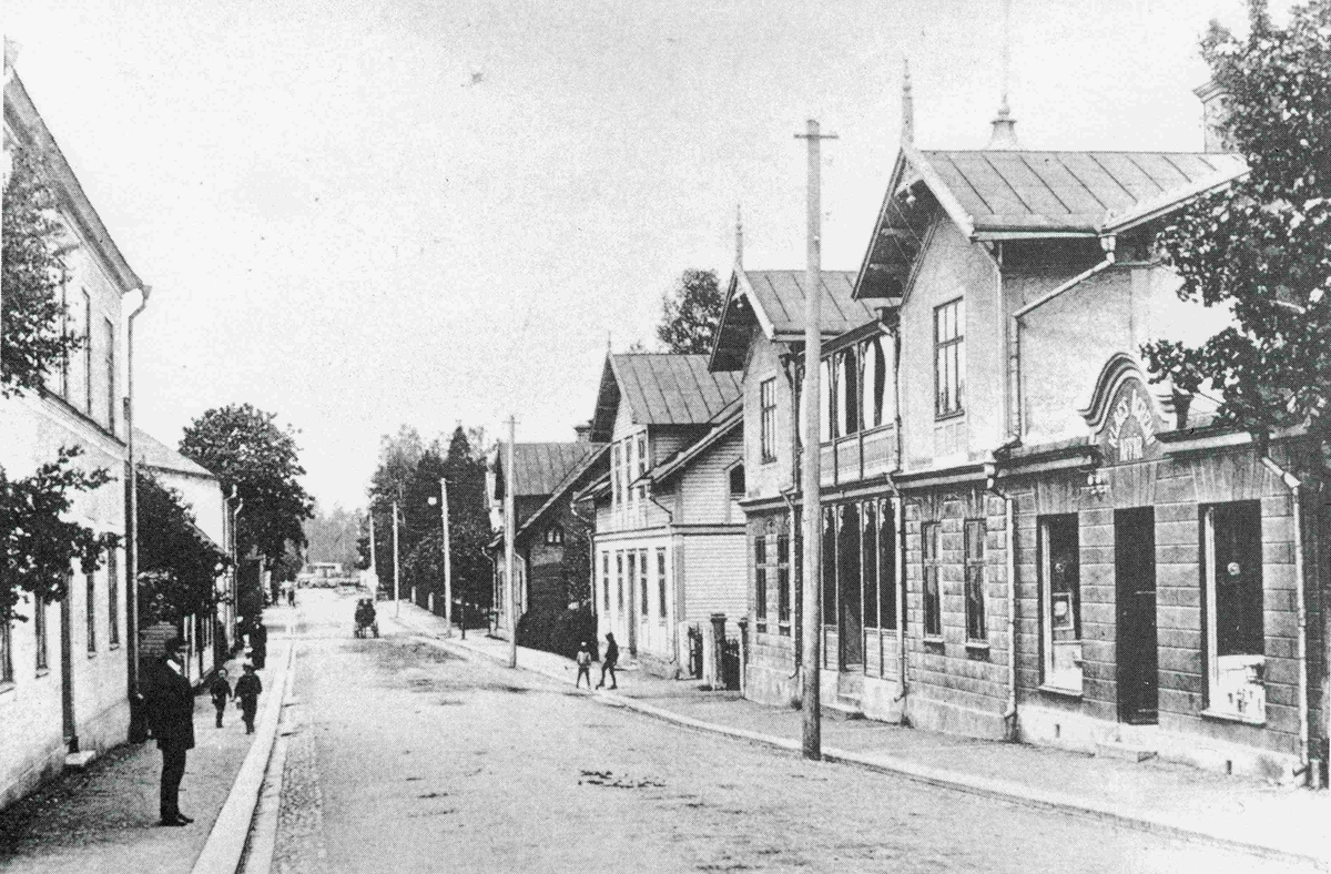 Långgatan i Nybro omkring 1910 med grosshandlare Claes Ågrens affär.