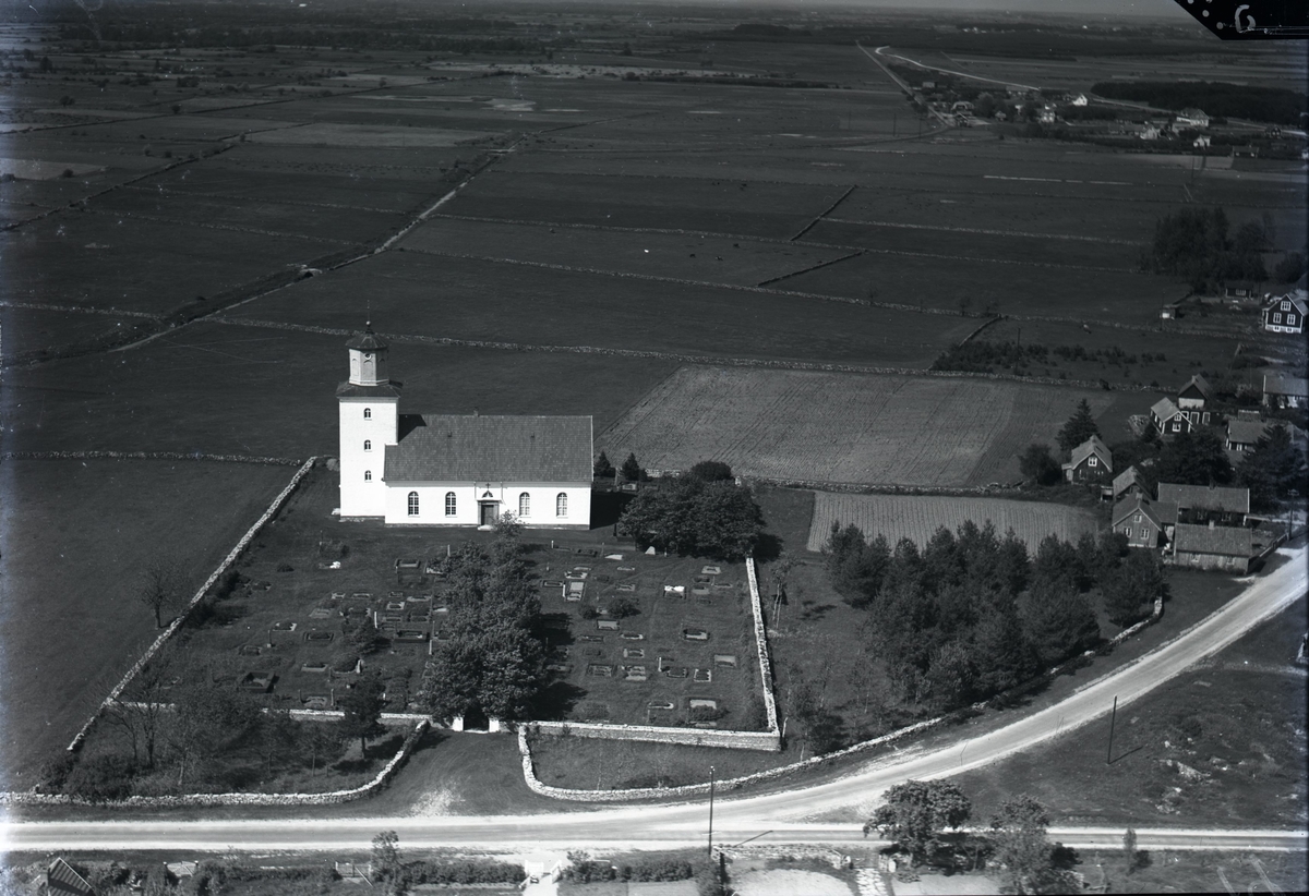 Flygfoto över Gårdby kyrka och kyrkogård på Öland.