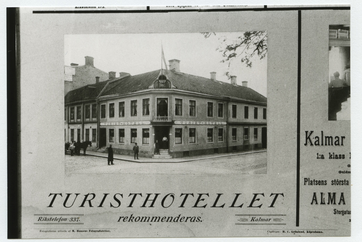Detalj av annonstavla daterad 1908. Turisthotellet, hörnet Larmgatan - Ölandsgatan.