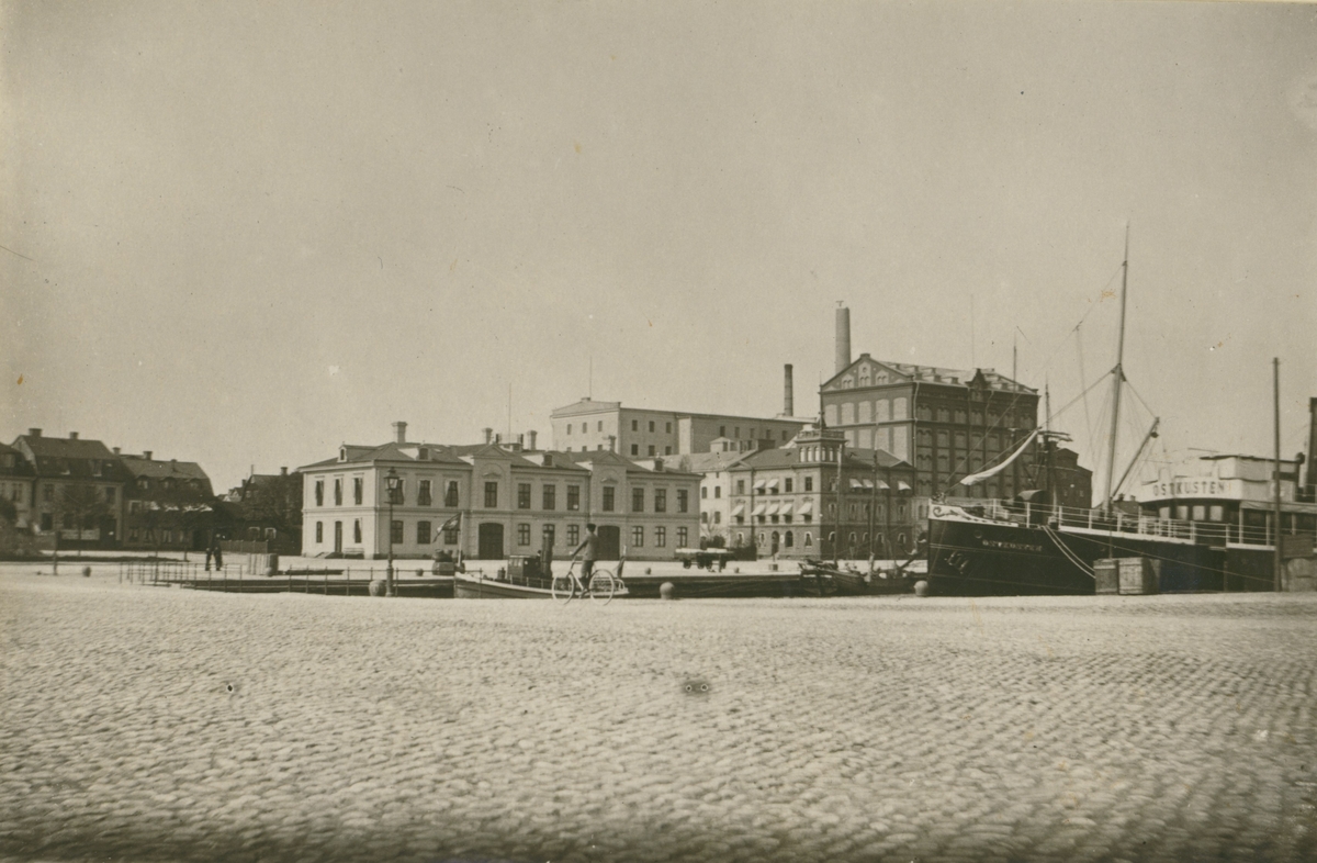 Tullhuset och ångkvarnen sedda från Skeppsbron. Till höger ett ångfartyg vid namn "Ostkusten"