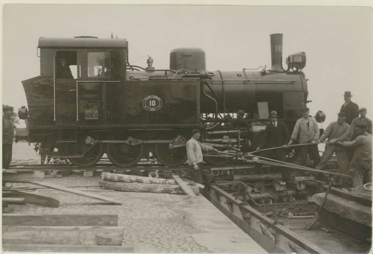 Ett ånglok tillhörande Ölands järnväg lastas på ett fartyg i Kalmar hamn.