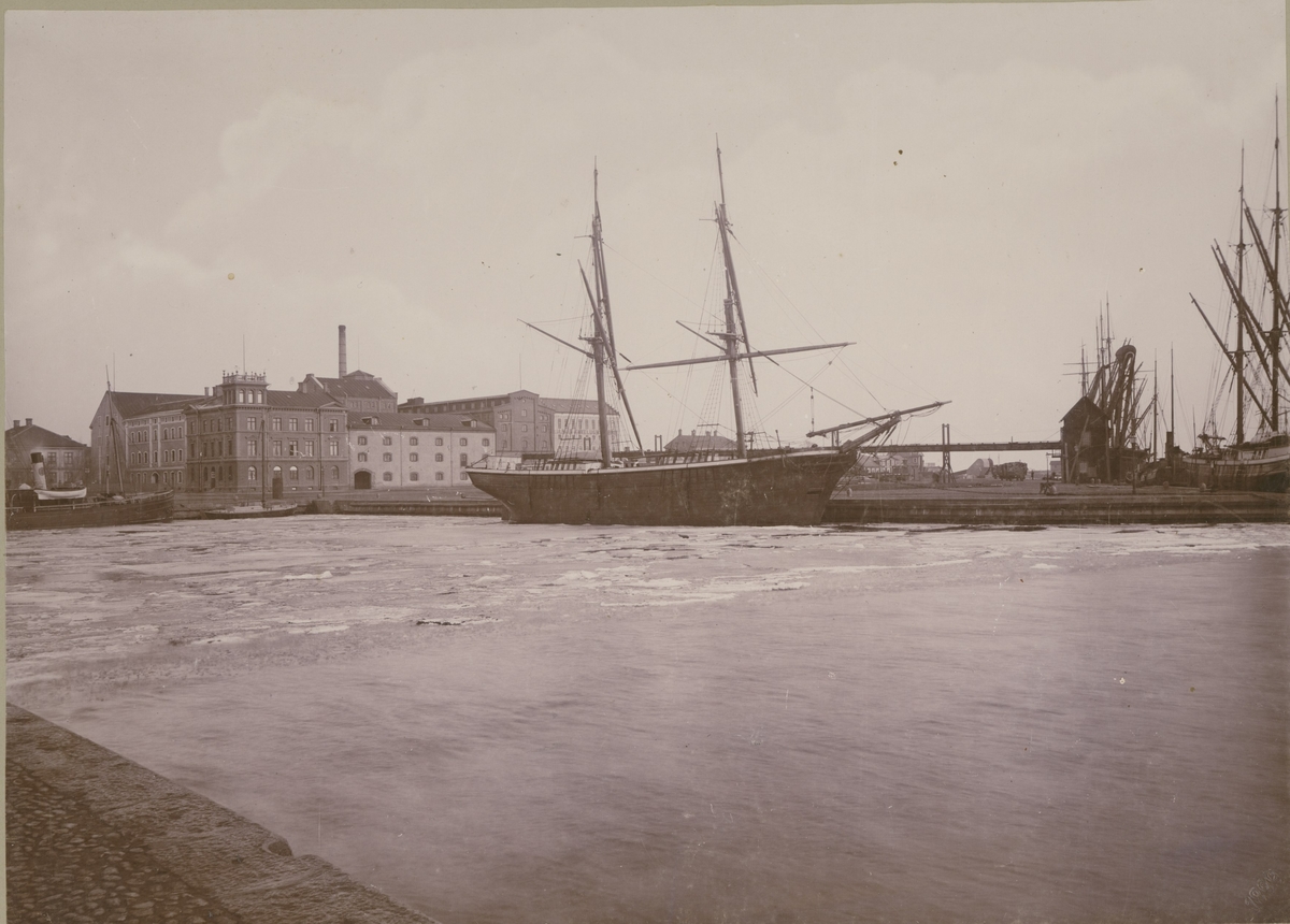 Briggen Termanille förtöjd i Tullhamnen. I bakgrunden ångkvarnen och spannmålselevatorn.