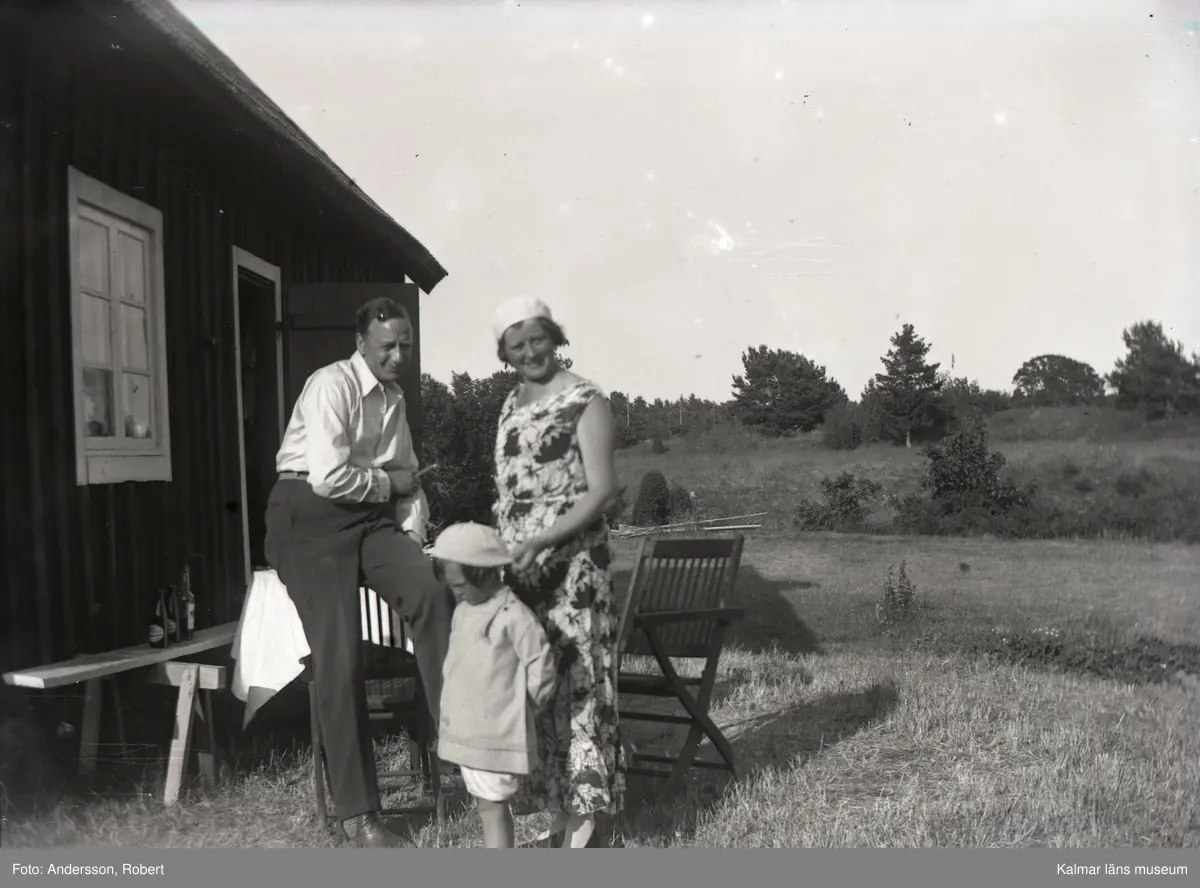 Manne Hofrén med hustru Karin och sonen Erik utanför familjens sommarstuga på Drag, Ryssby s:n.