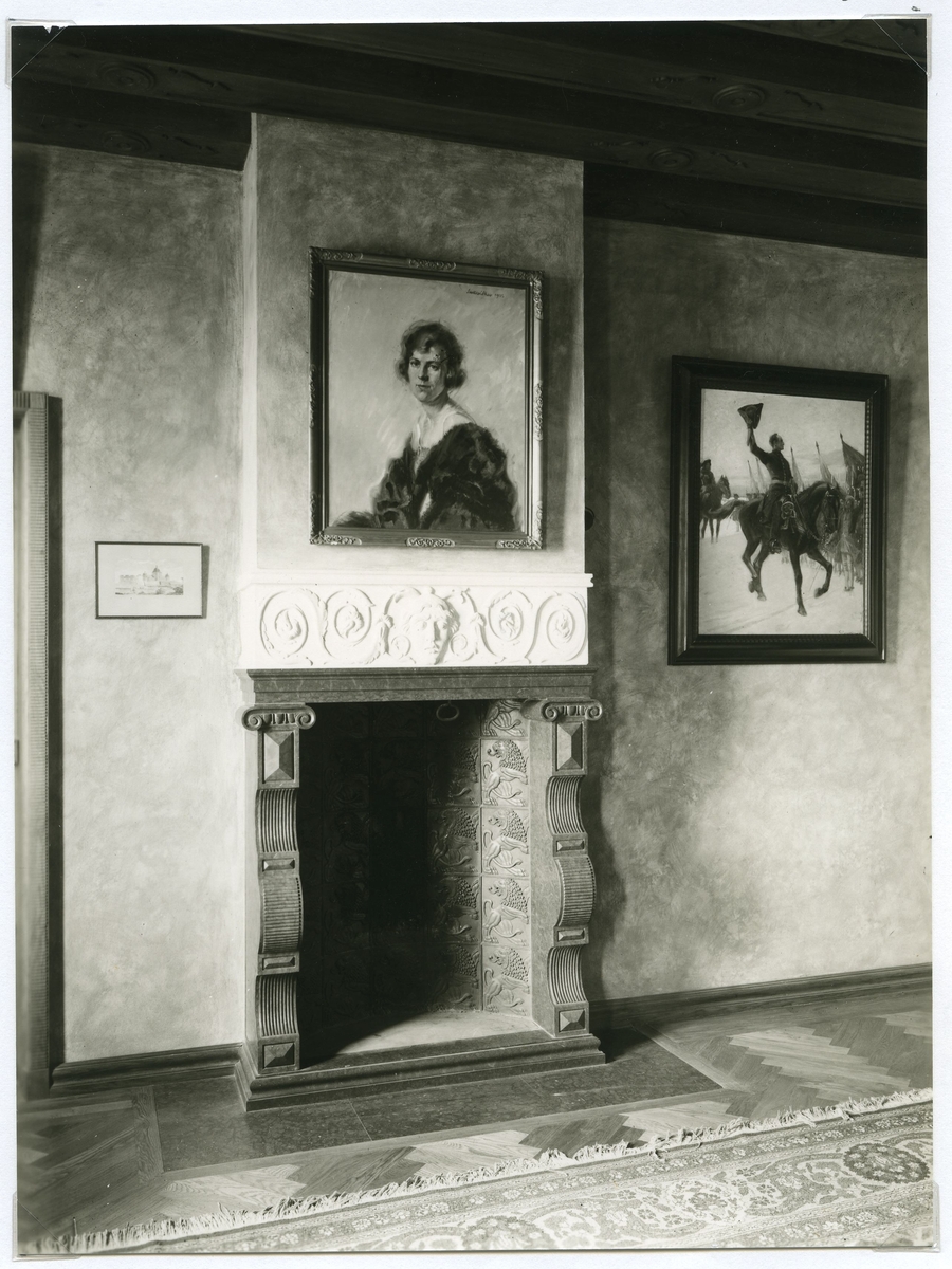 Öppen spis med lejonfris i salong på Villa Hertha.