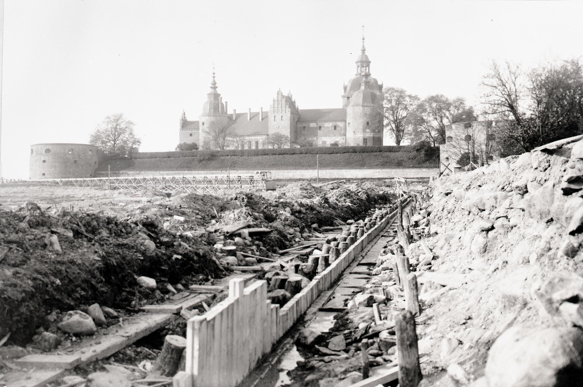 Pålningsarbete för kajkant mot Slottsfjärden vid Strandpromenaden. Arbetet utfört i samband med utgrävningen av Slottsfjärden då denna var tömd på vatten.