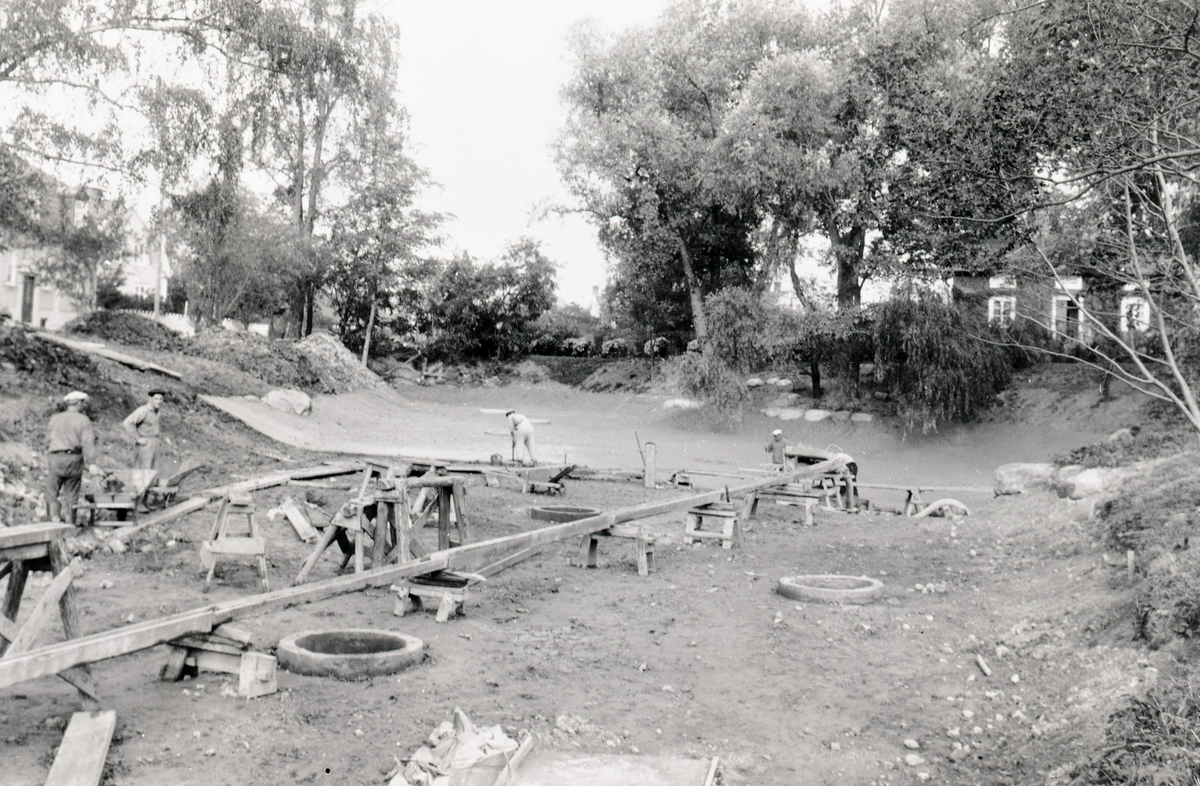 Anläggningsarbete av dammen vid St:a Britas gata.