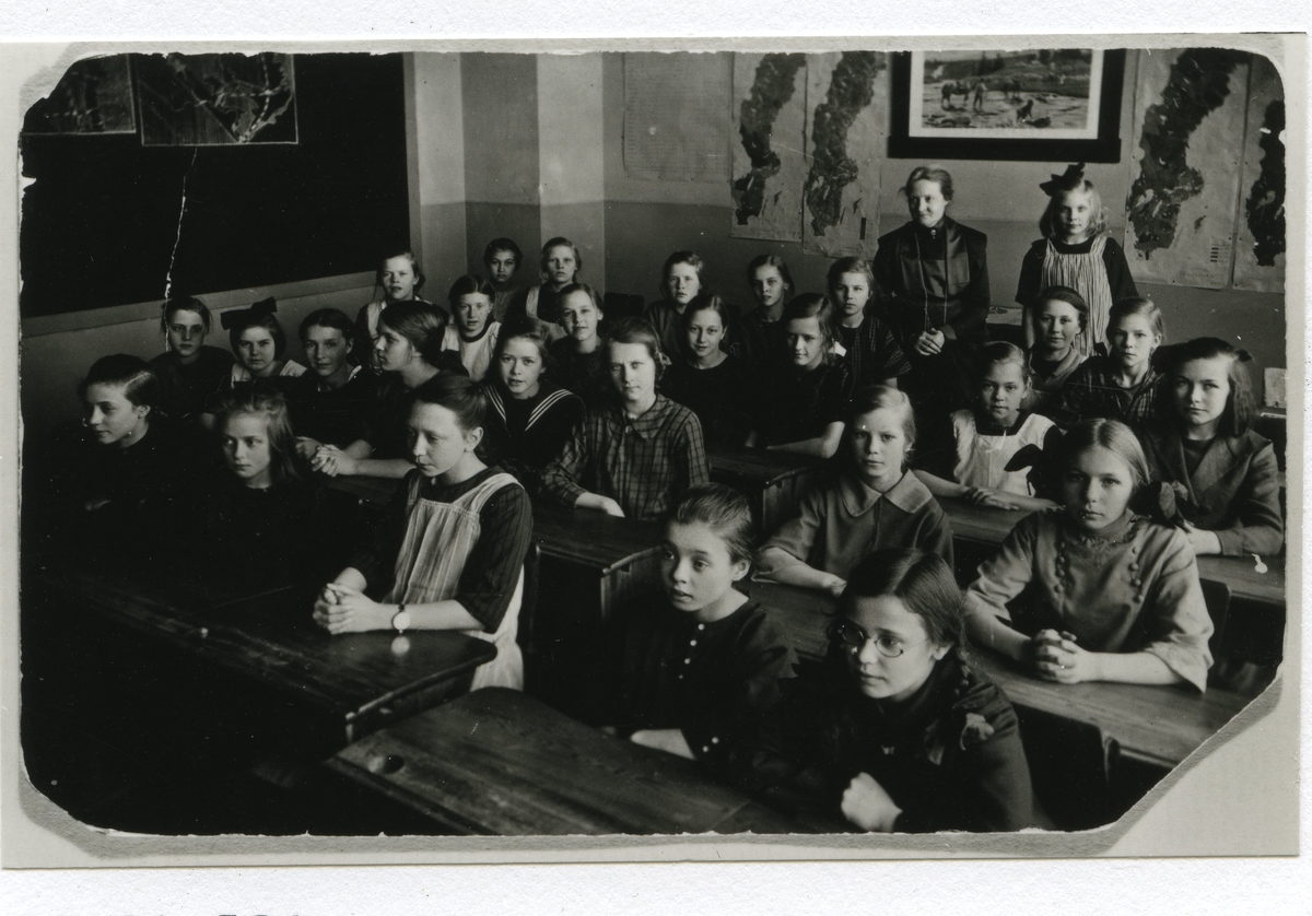 Vasaskolan. 4:e klass 1924. I mitten med rutig blus sitter Linnea Magnusson. Lärarinna Ida Johansson.