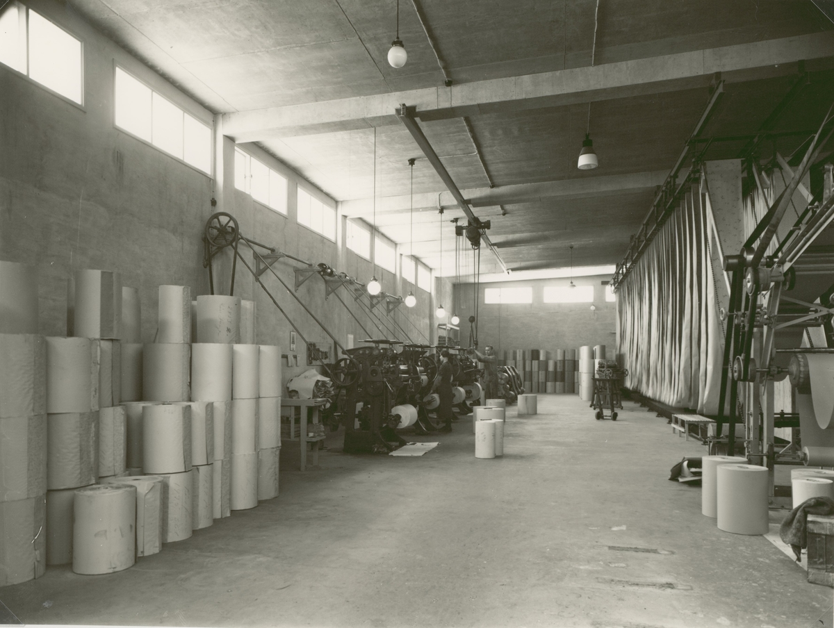 Kalmar Nya Tapetfabrik. Pårullning i en fabrikshall. Tapetrullar till vänster.