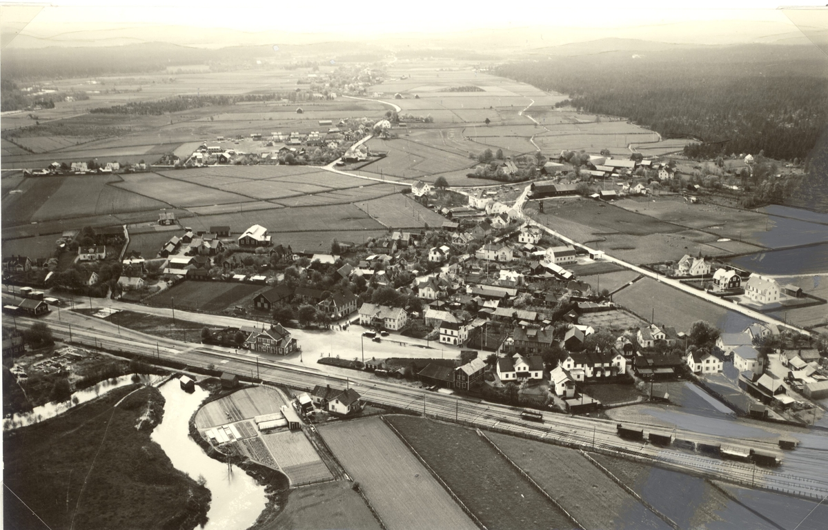 Flygfoto över Målilla, med järnvägsstationen och Stångådalsbanan.