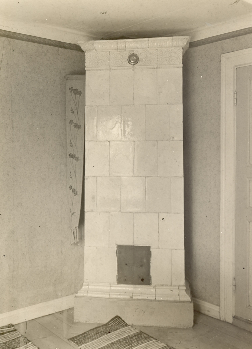 Huvudbyggnaden: Gul kakelugn i övre våningen. Frisen med reliefdekor.
