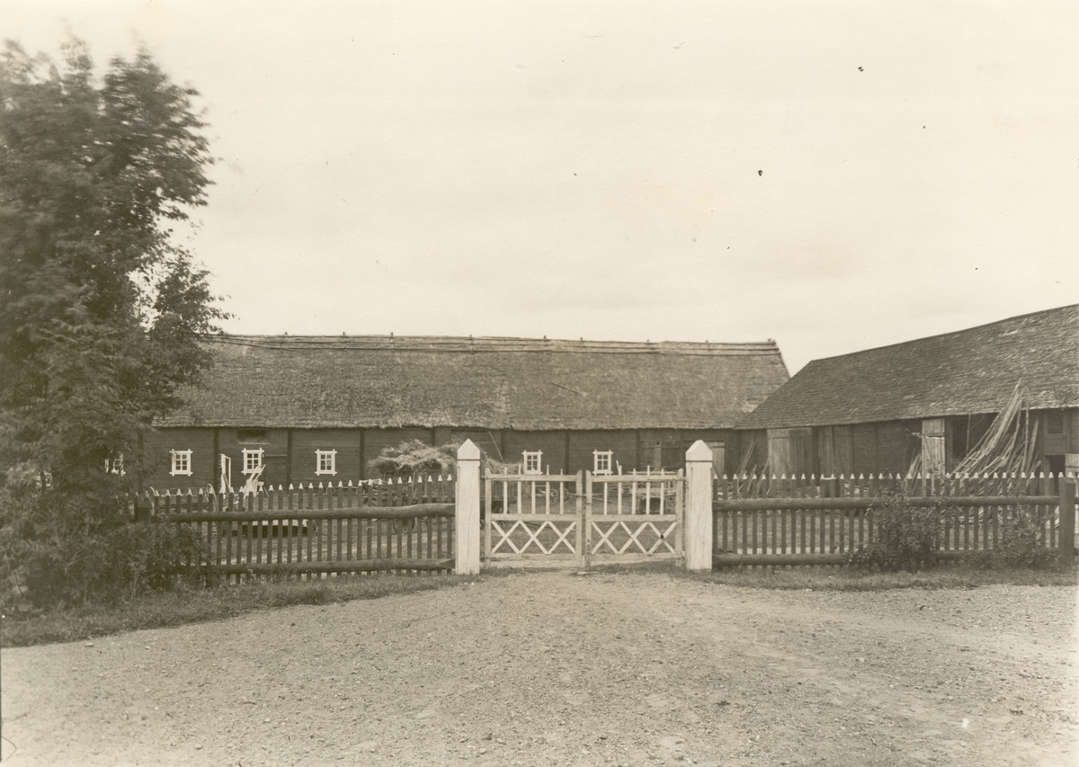 Ladugården, från mangårdsplanen. Röda skiftesverkslängor under bundet halmtak. Från 1800-talets senare del.