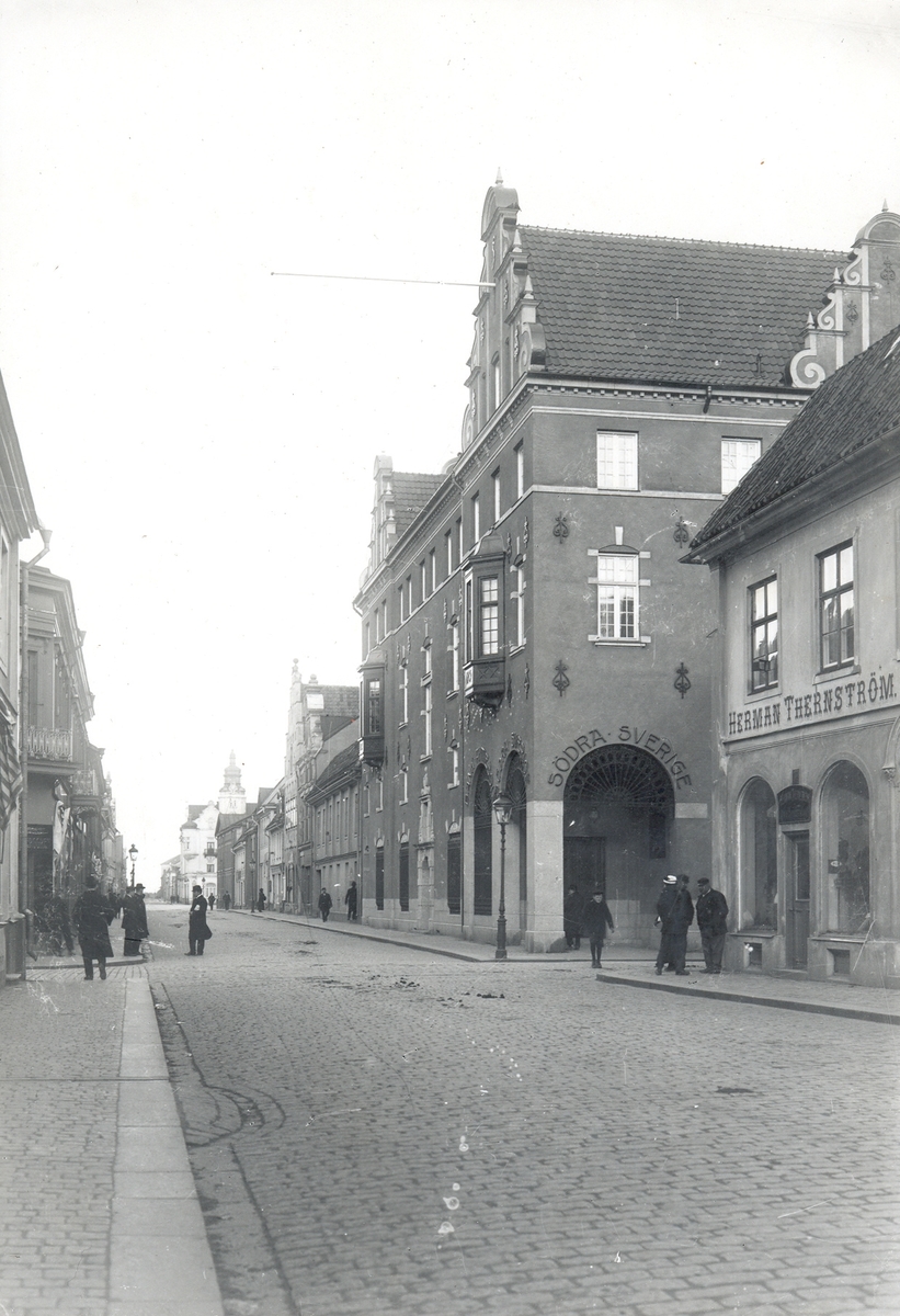 Korsningen Storgatan - Kaggensgatan i Kalmar med bankbyggnad och butiksbyggnader.