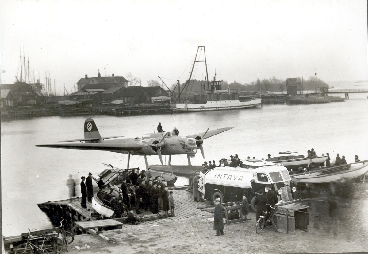 Tyskt flygplan i Ängö flyghamn 1939. I bakgrunden syns Varvsholmen med en kalmarsundsfärja förtöjd.
