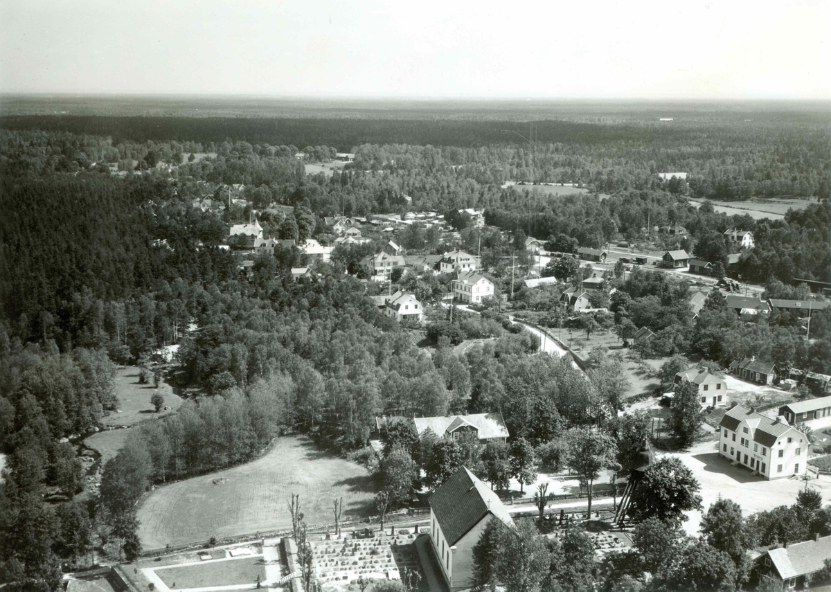 Flygfoto över Påryd. Samhället med hus vägar och skog.
