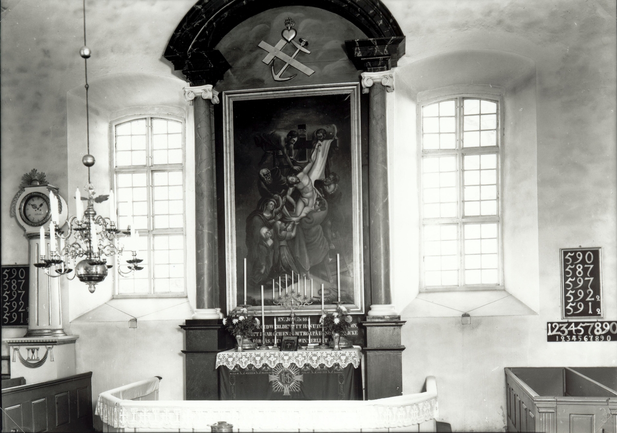 Altaret i Dörby kyrka. Altartavlan är utförd 1843 av Sven Gustaf Lindblom med motivet Kristi nedertagande från korset.