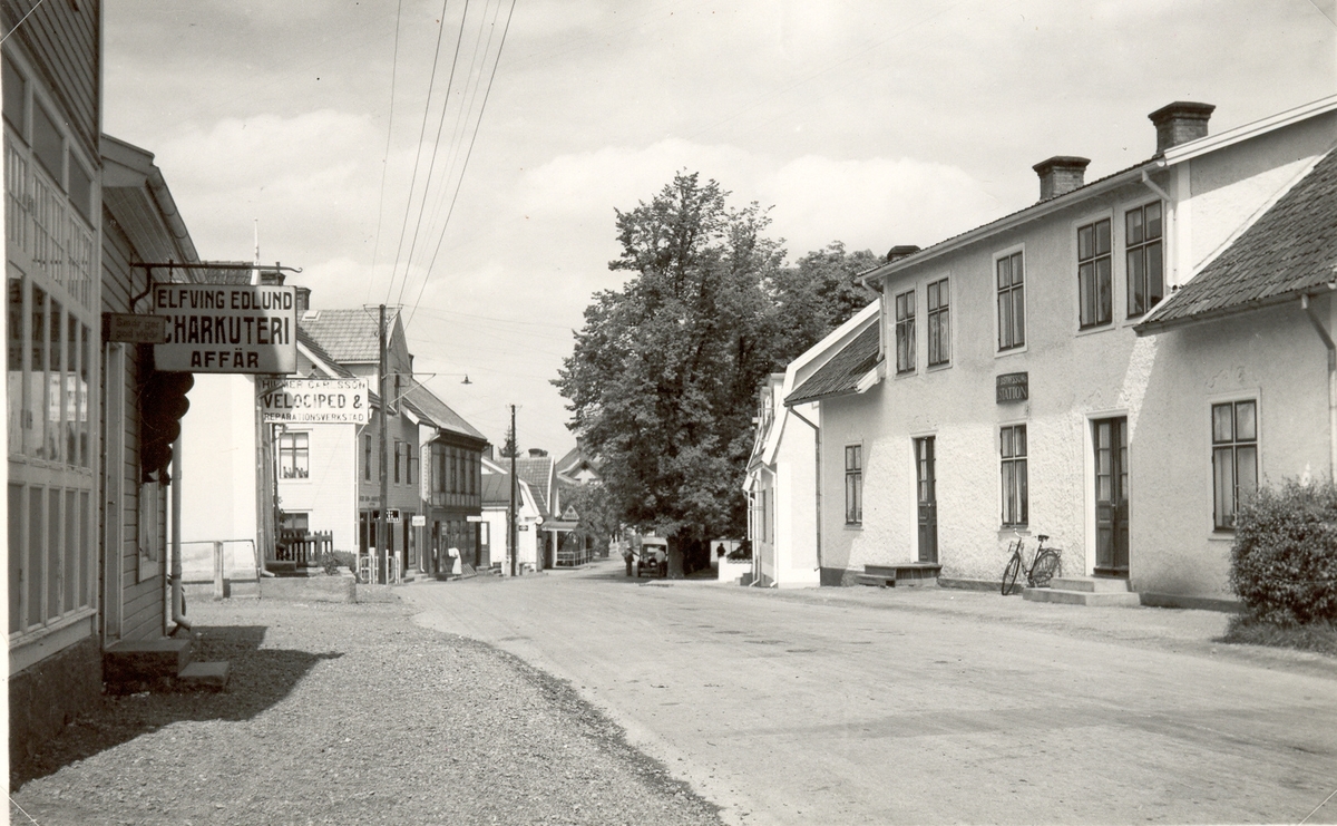 Vykort med motiv från Högsby. Elfving Edlunds charkuteriaffär till vänster.