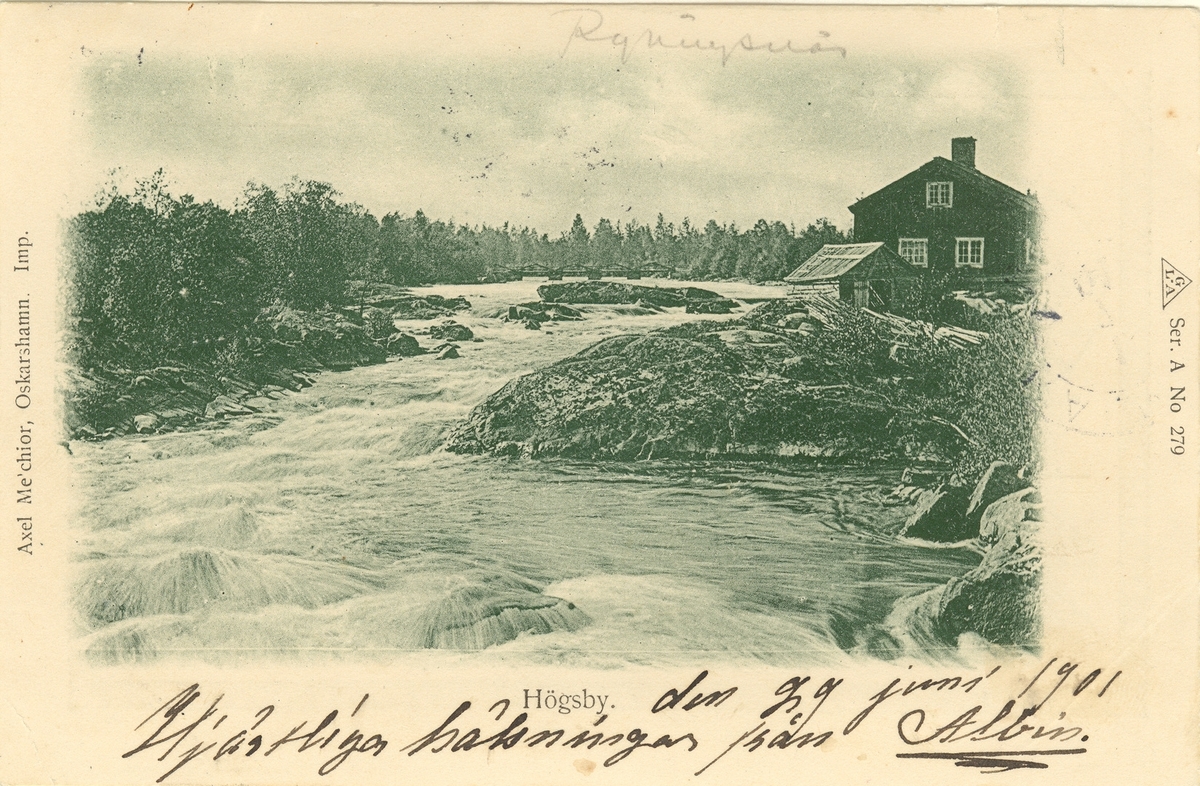 Vykort med motiv från kvarnen i Högsby. Observera träbron i bakgrunden.
