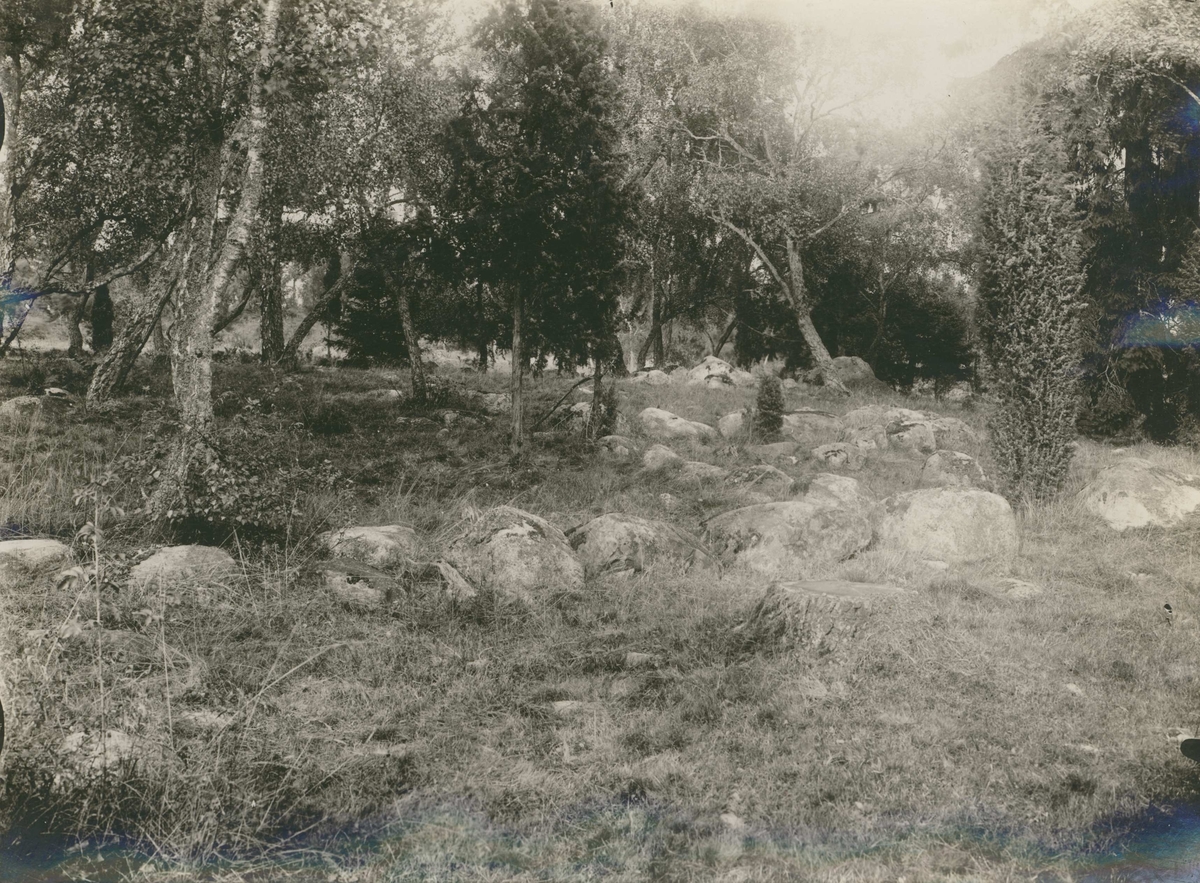 Stensättningar vid åns utlopp i Binga, ett system av rektangulära husgrunder.