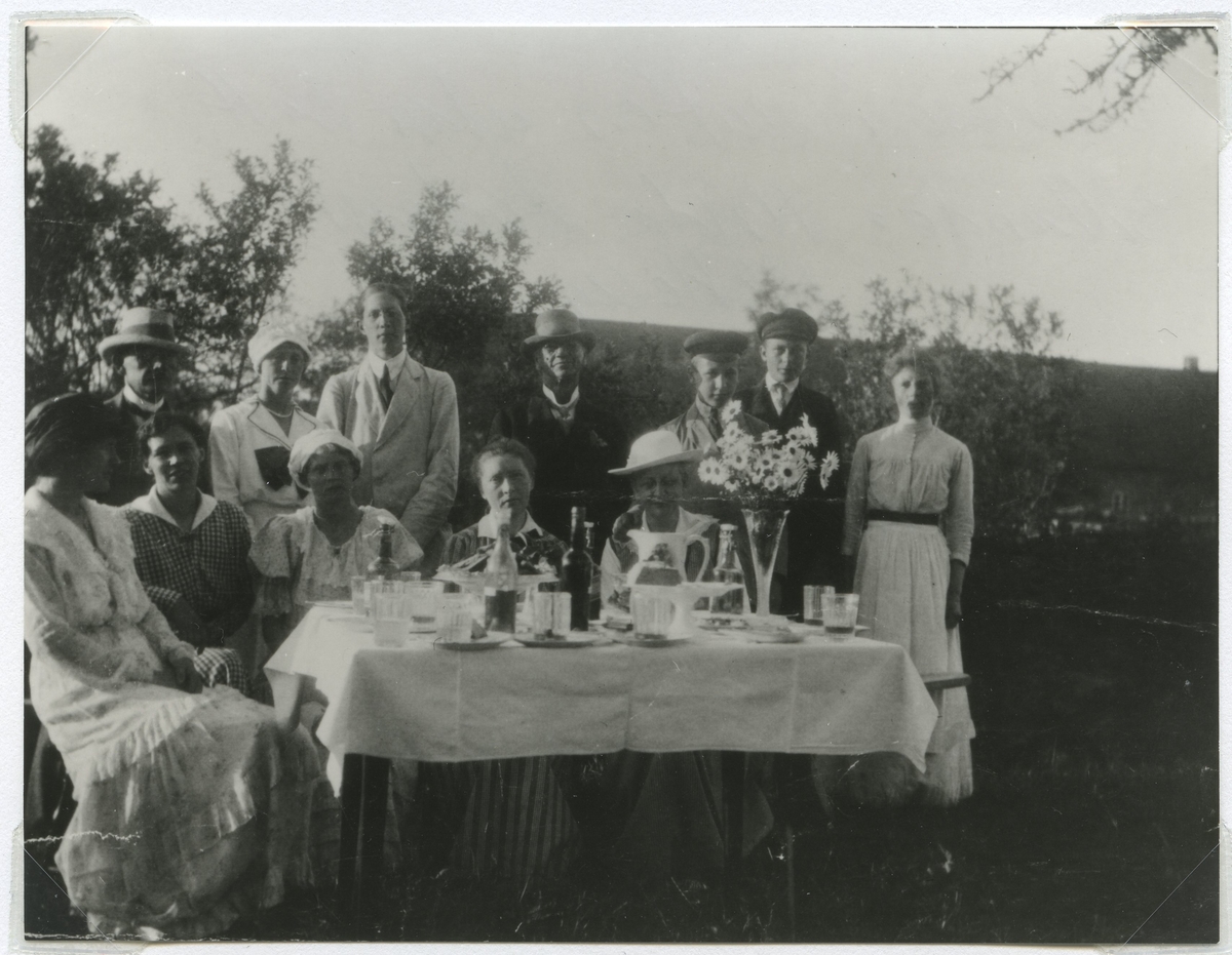 Damen i mitten utan hatt, sittande, är Hilda Andersson, Vickleby. Den unge mannen som står bakom blombuketten är Hilmer Andersson, född 1901.