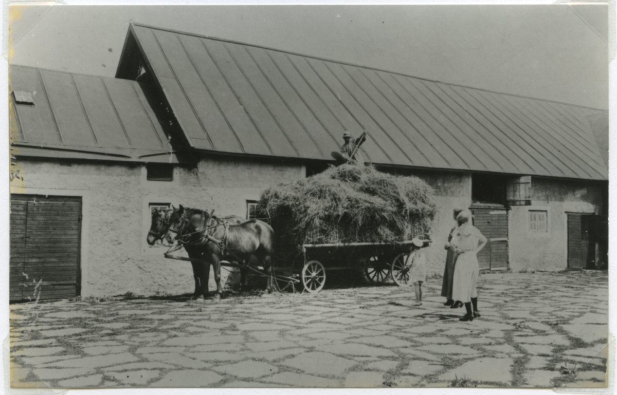 Capellagårdens nuvarande matsal/slöjdsal. På hölasset sitter Andersson cirka 1915-1920.