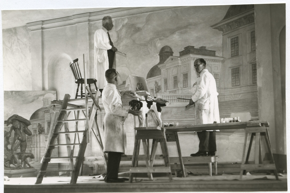 Prins Eugen (överst), målarmästare Erik Lönnegren, Kalmar (till vänster). Vid arbete med dekoration av Kalmar Nya Läroverk (Stagneliusskolan) omkring 1932.