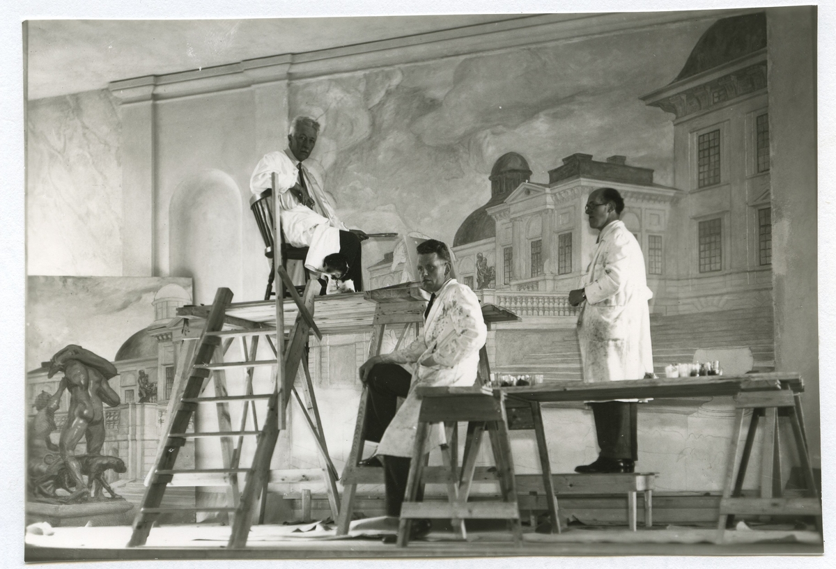 Prins Eugen [till vänster] och målarmästare Erik Lönnegren, Kalmar [i mitten], vid arbete med dekoration av Kalmar Nya Läroverk (Stagneliusskolan) omkring 1932.