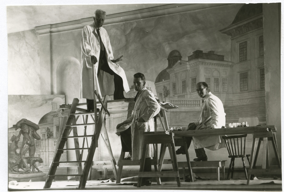Prins Eugen [till vänster] och målarmästare Erik Lönnegren, Kalmar [i mitten], vid arbete med dekoration av Kalmar Nya Läroverk (Stagneliusskolan) omkring 1932.