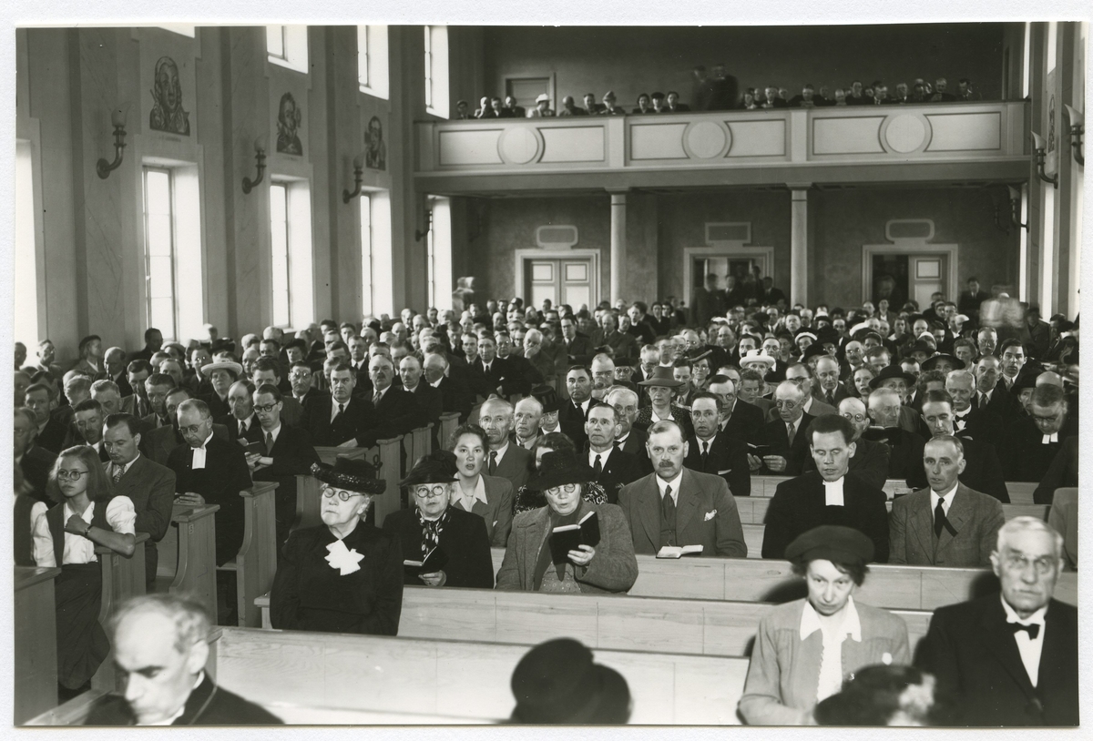 Läroverkets aula. Biskop Yngve Brillioth, J O Svensson, Runsten, Gunnar Larsson, Gärdslösa, prosten Jannert, Böda.