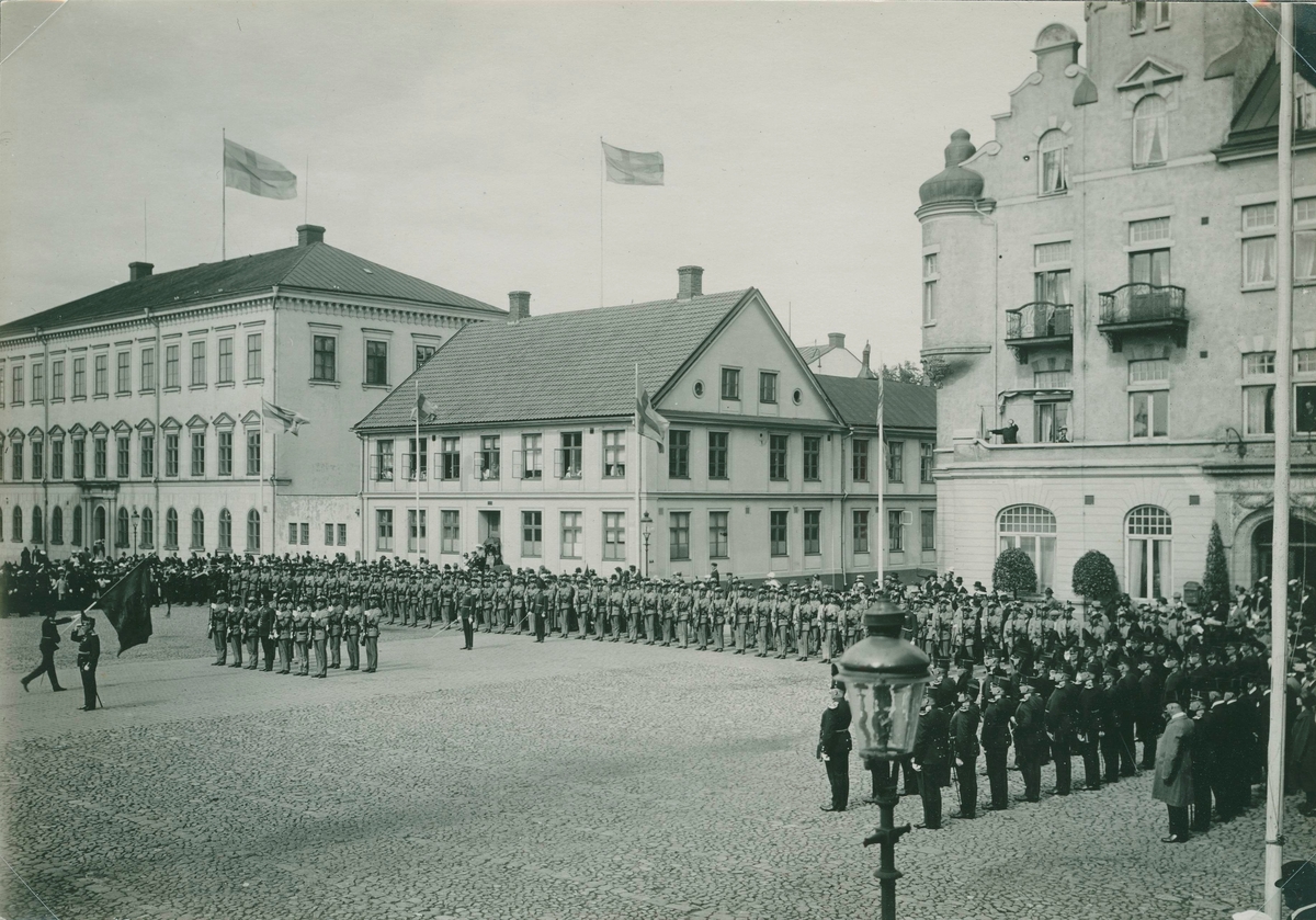 Från invigningen av Kalmar Regementes minnessten i Stadsparken. Paraden ställer upp på Stortorget.