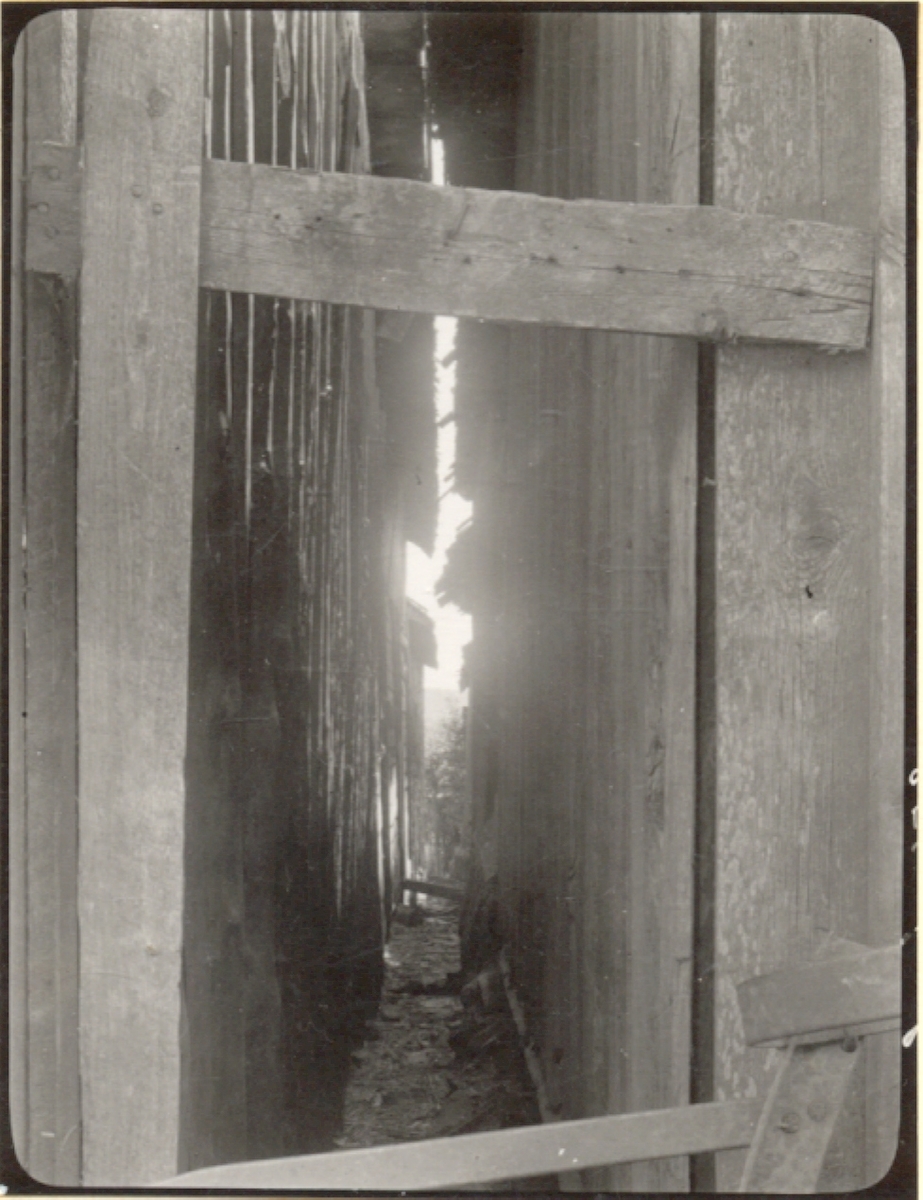 Skillnadsgata mellan Robert Karlssons och Gunnar Sandgrens gårdar. Den förres till vänster och den senares till höger. Logar och ladugårdar.