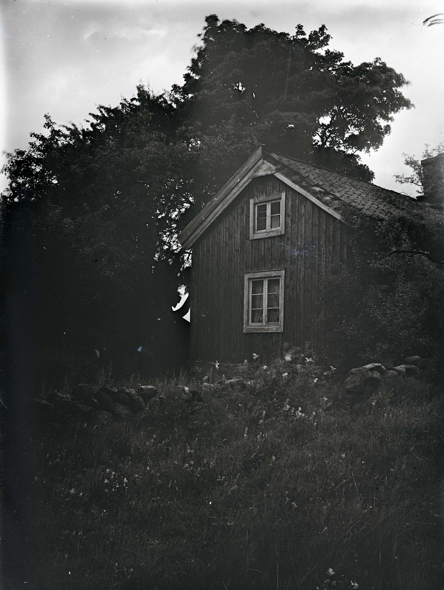 Manbyggnaden från gaveln och bakifrån. Torvtak med senare tegel. Skorsten med typiska stora droppflisor.