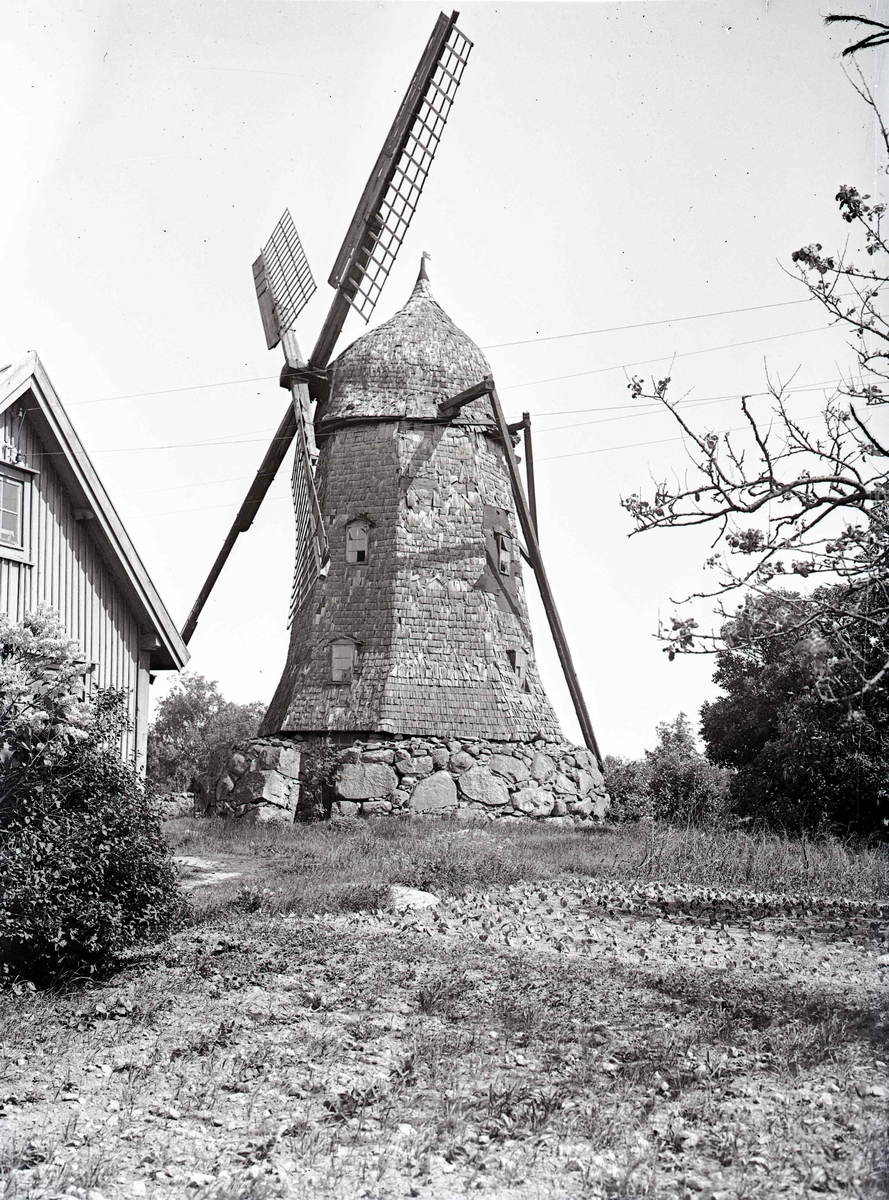 Holländsk kvarn vid stora landsvägen till Kalmar. Spånklädd, grå.