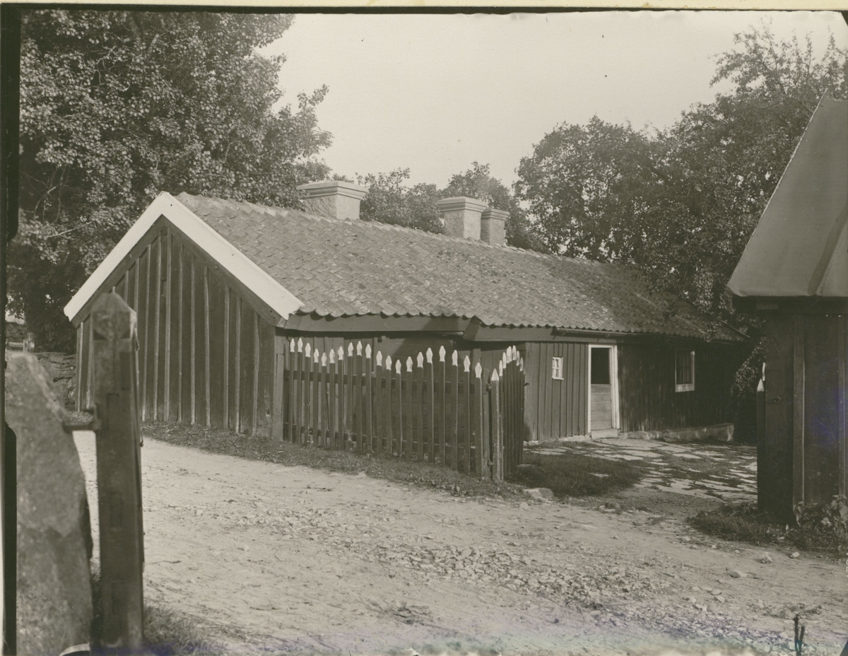 Gammal gård vid gatan mot Runsbäck. Stugan är en lång, låg envåningslänga, sammanbyggd med diverse bodar.