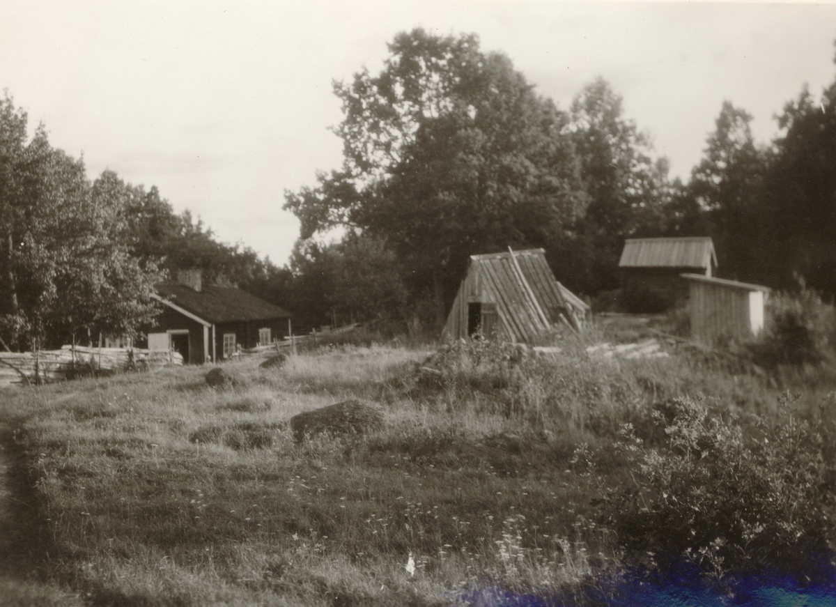 Vedskjul av en typ, som ganska oftar är förträdd i denna trakt, vägen mellan Hjorted - Kristdala. Torpet på bilden heter Karlsgärde. Vedskjulet i förgrunden.