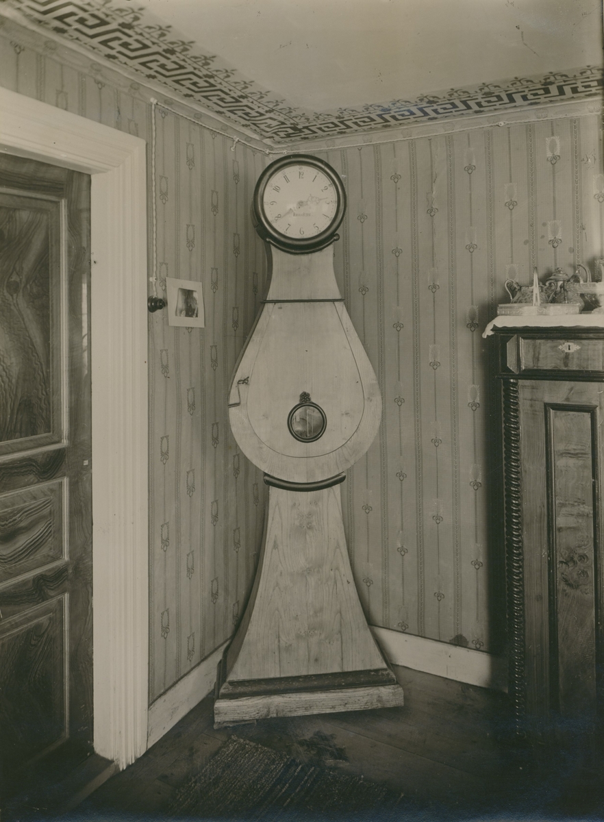 Interiör från huvudbyggnaden på en gård i Tribäck, med ett golvur i björk som är signerat av Johan Bern.
