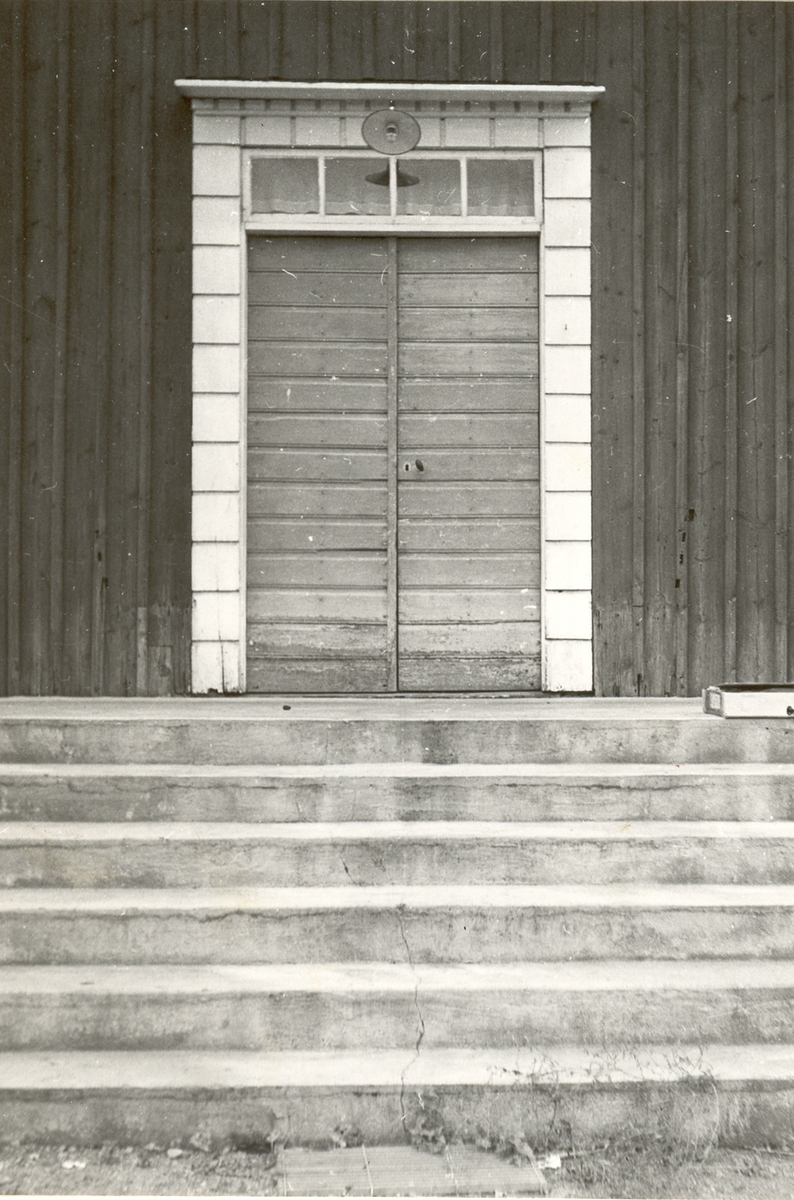 Ovan manbyggnadens baksida och ena gavel. Nedan huvudentrén, vitmålad omfattning och bruna dörrar. Trappan av cement.