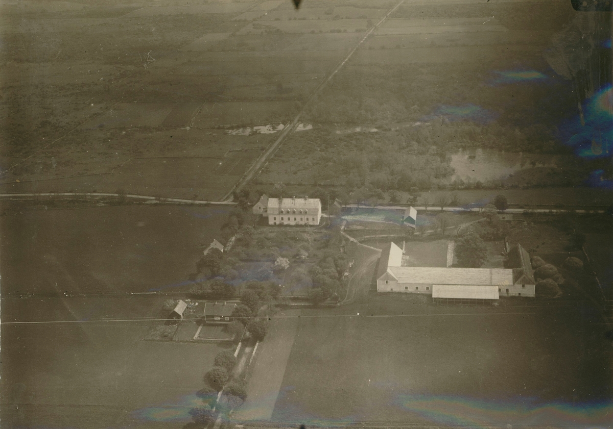 Halltorp från luften. Vid vägen mangården med huvudbyggning och två flyglar. Hitom byggningen trädgård varifrån en väg löper i rak riktning ned mot sundet. Trädgården är terasserad. Mitt för mangården på andra sidan vägen även en trädgårdsanläggning, fordom köksträdgård. Till höger ladugården, som nybyggdes under ägaren Perssons tid.