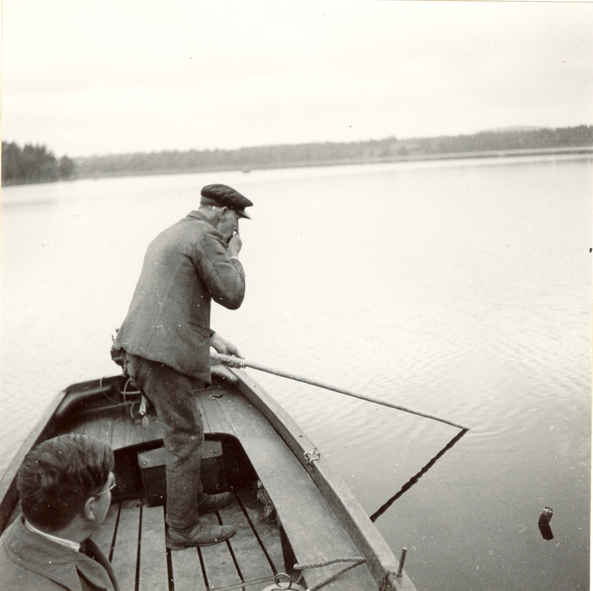Fiskaren sprutar ut brödsmulor över vattnet i Allgunnen, där han sänkt ned håven för att locka löjorna.