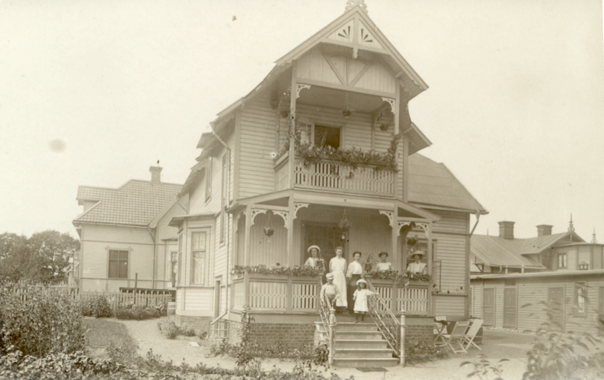 Från vänster: Lily Schmitz, Hulda Schmitz, Otilia Böhme, faster Margit Schmitz, Ellen Johansson, Romano Schmitz, Aina Schmitz.
